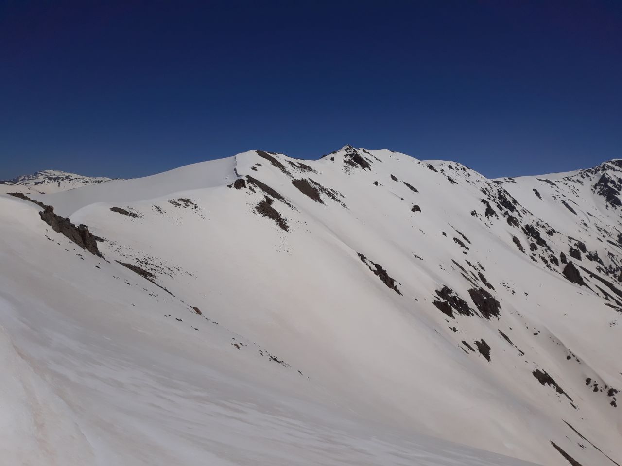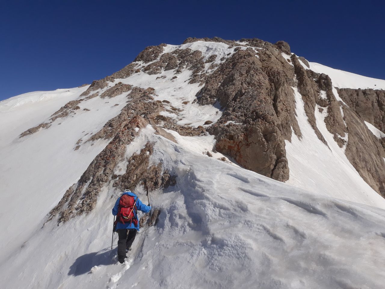 با گذشتن از یال های کوچک و بلند مسیر به زیر قله ونتار رسیدیم.قله سنگی ونتار را شنیده بودم که شکوه و سختی خاصی دارد . ما برای رسیدن به قله باید قسمت تاج قله که کاملا سنگی بود را صعود میکردیم.اما مسیری دیگر هم میتوانست جالب باشد آن هم مسیر دهلیز پر برفی بود که به قله میرسید .پیشنهاد بنده این مسیر بود که من به عنوان نفر اول جلو رفتم. گام به گام برف کوبی میکردم .دهلیز شیب تندی داشت و باید نفرات با فاصله ایی ایمن از یکدیگر عبور میکردن .واگر خدایی نکرده دهلیز فرومیریخت نفرات پشتی بتوانند عکس العمل و موقعیت نجات داشته باشند .