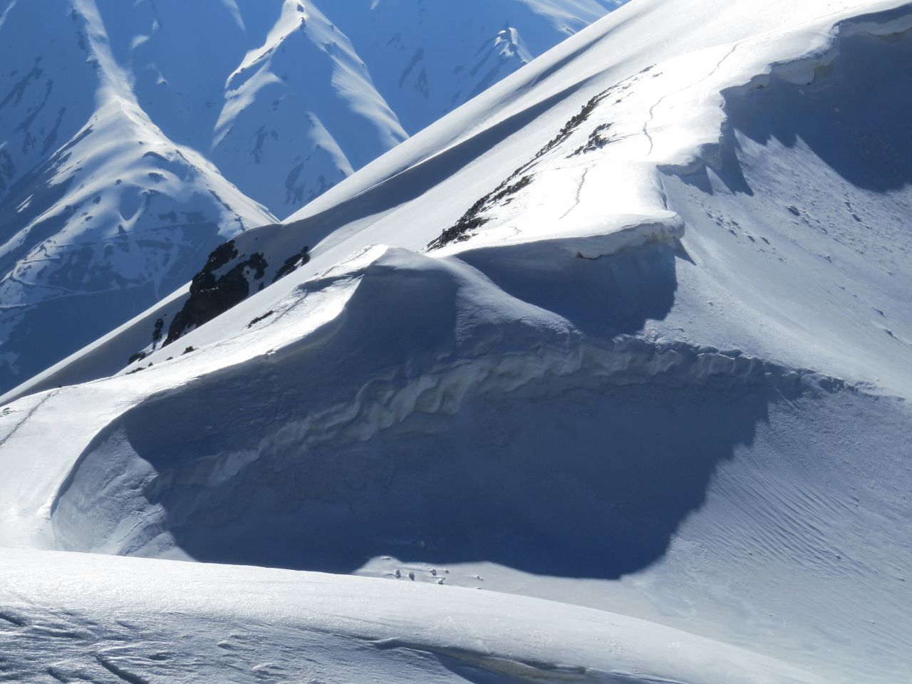 ابتدای فرود برف یخ زده بود و بی احتیاطی مساوی با حادثه ایی بزرگ بود .با کلنگ مسیر را باز میکردیم و مراقب قسمت های یخی مسیر بودیم . این قسمت ها وقت زیادی از ما گرفت . با هزار درد سر به گردنه سیرابشم درست زیر قله کهار رسیدیم . این گردنه ۳۳۳۰ متر ارتفاع داشت .ما یه چیزی حدود ۷۵۰ متر از قله کهار ارتفاع کم کرده بودیم و این خیلی سنگین بود برای ما چرا که صعود ادامه داشت .