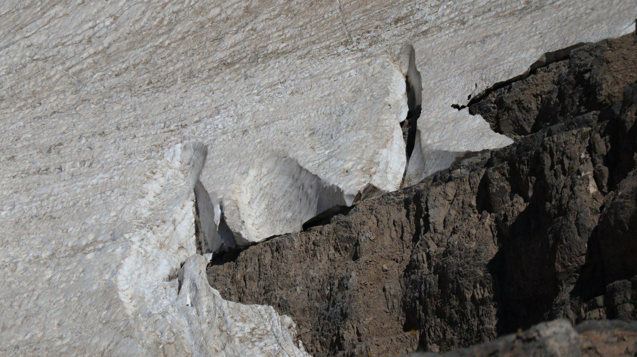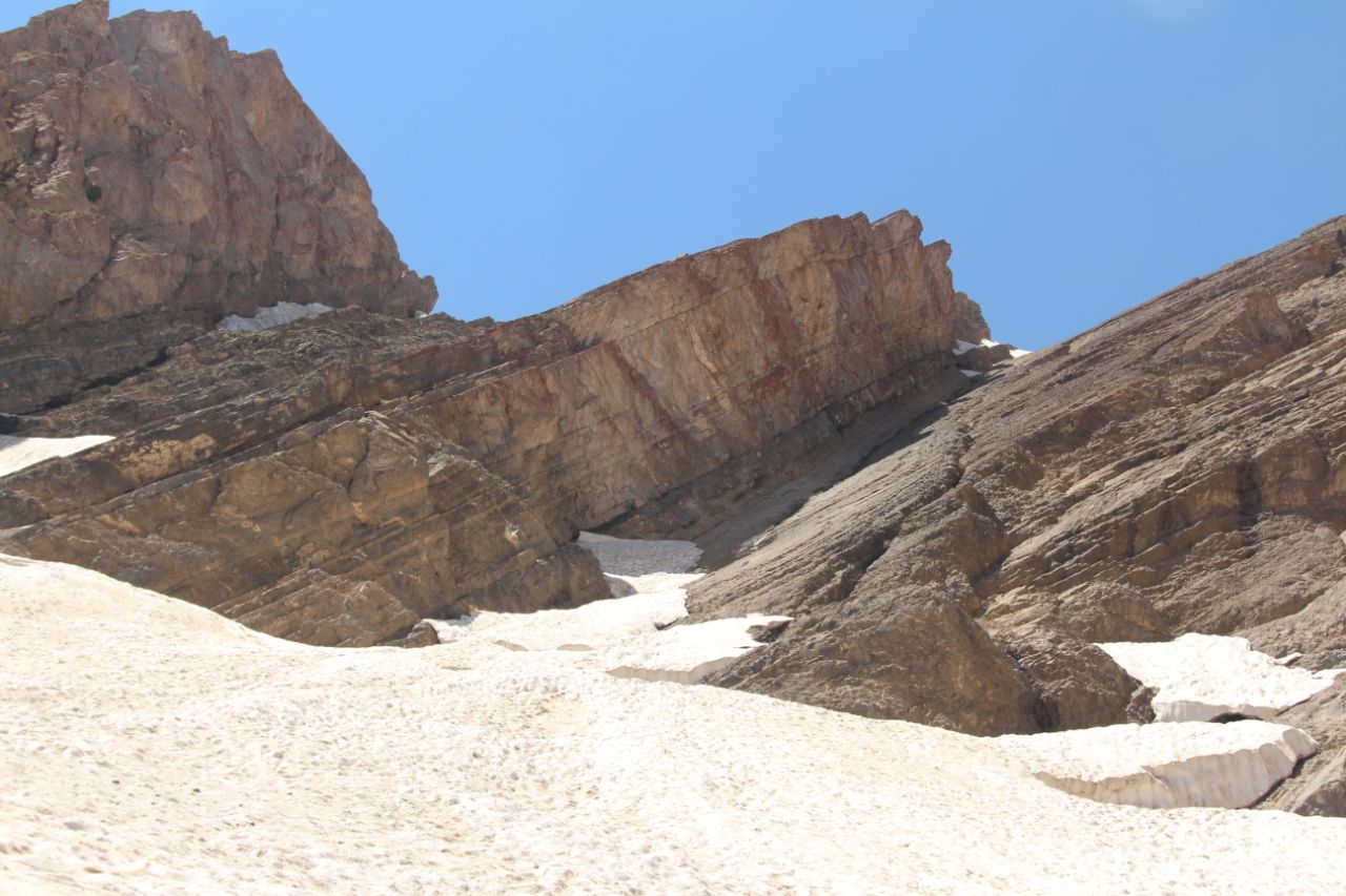 با۴۴ نفر از دوستان که تعداد زیادی بود و من میدانستم که به جایی نخواهیم رسید به مسیر ادامه دادیم . بعد پناهگاه چند برف چال کوچک در مسیر داشتیم که با حمایت بنده و علی موتابیان گروه را به یال اصلی سوق دادیم .ساعت ۱۱:۳۰ به زیر تیغه ها رسیدیم .تصمیم براین شد که گروه را از سمت شصت خدا ویا دهلیز میانی ها به بالا ببریم .
