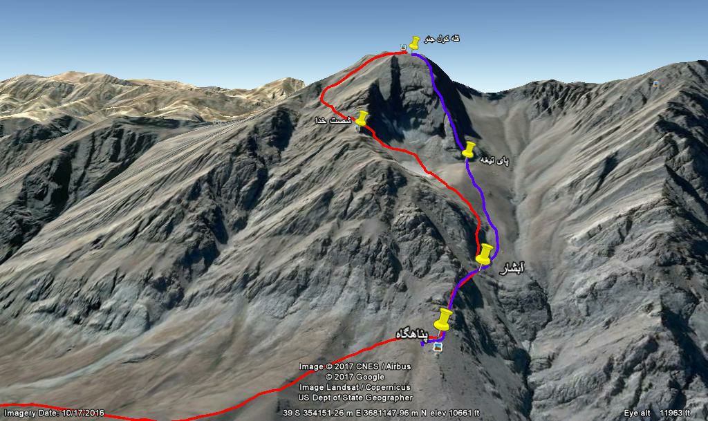 مسیر دره را فرود آمدیم .مسیر پاکوب کاملا مخفی قرار داشت .پاکوب مارا به سمت چپ میرساند در ساعت ۱۸:۴۵ به پناهگاه رسیدیم و کمی استراحت کردیم و به سمت پایین حرکت کردیم و ساعت ۲۱:۳۰ به پارکینگ روستای کمندان رسیدیم.